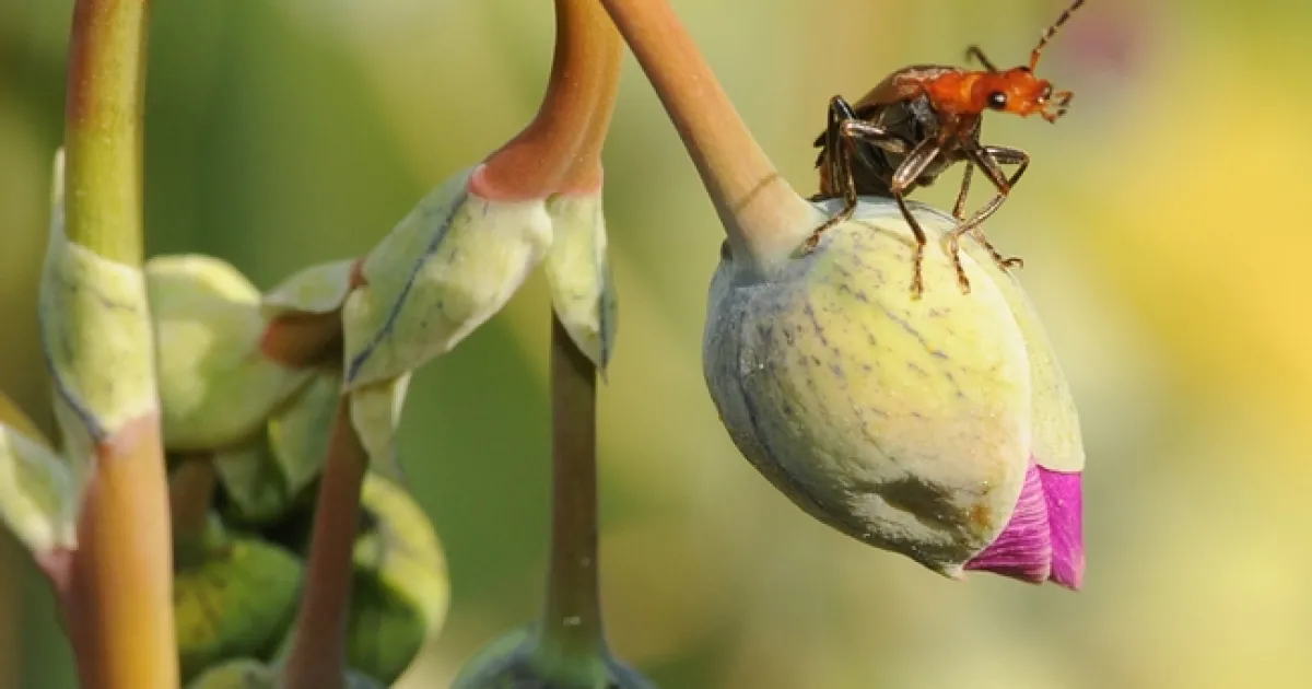 Soldier beetle (famiy Cantharidae) perched on rock purslane bud. (Photo by Kathy Keatley Garvey)
