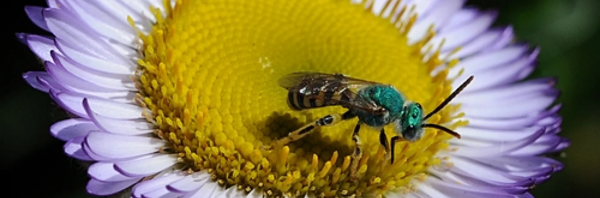 We spotted this male green sweat bee, Agapostemon texanus, on what is commonly known as a Seaside daisy, Erigeron glaucus Wayne Roderick. This is a lavender-petaled flower with a yellow center.