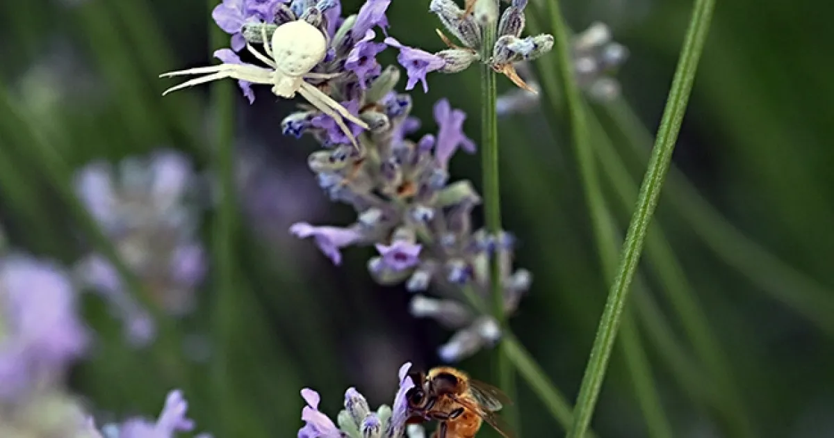 A crab spider,  family Thomisidae, lies motionless in a patch of lavender, waiting to ambush a honey bee.