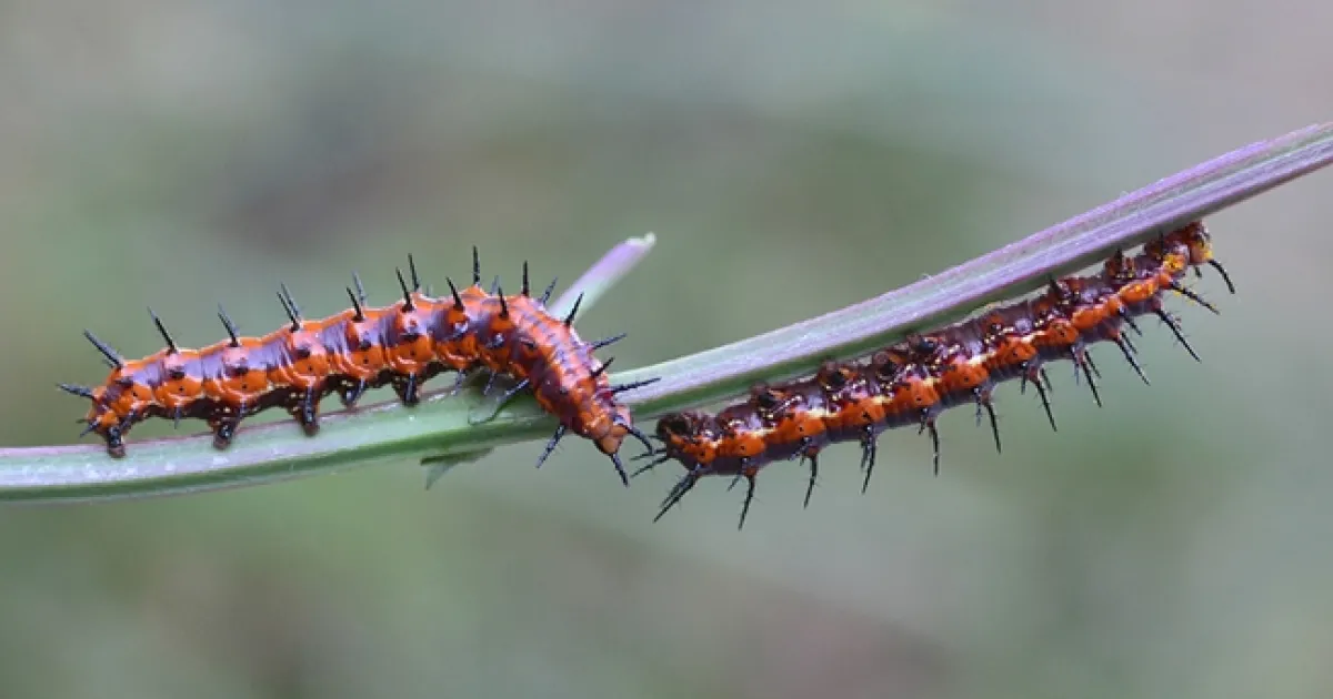 But we like it that way. The tiny reddish orange caterpillars will turn into glorious reddish orange butterflies, Agraulis vanillae. It's a tropical and subtropical butterfly with a range that extends from the southern United States all the way to central Argentina, according to butterfly expert Art Shapiro, distinguished professor of evolution and ecology at the University of California, Davis, who has monitored scores of butterfly species in the Central Valley for more than four decades. (See his website.)