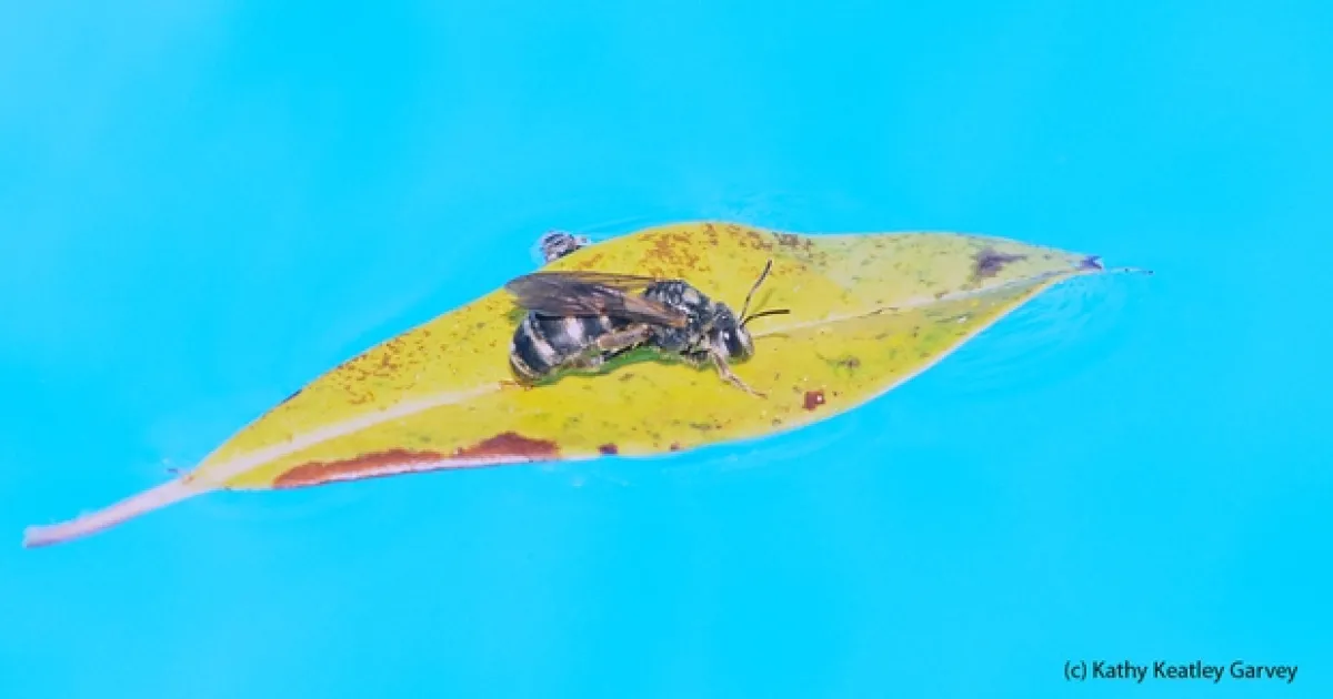 This tiny female sweat bee, genus Halictus (probably H. tripartitus, as identified by native polinator specialist Robbin Thorp, emeritus professor of entomology at the University of California, Davis, fell into our pool and then managed to save herself by climbing onto a cherry laurel leaf.