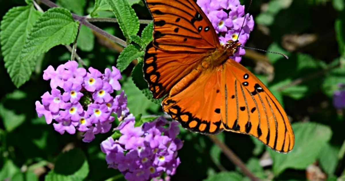 The Gulf Fritillary butterflies (Agraulis vanillae) flutter daily around our backyard. They stop for a little nectar from lantana (family Verbenaceae), and then head over to the passion flower vines (genus Passiflora) to breed or lay their eggs.