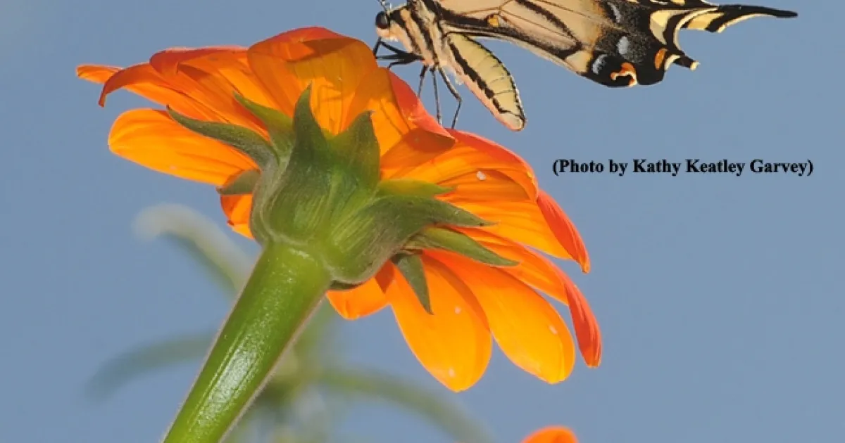 The spectacular butterfly, one of the most recognizable of all butterflies, glided to the patch of Mexican sunflowers (so named because they originate from Mexico and Central America) sipped a little nectar, and then fluttered away, only to return again.