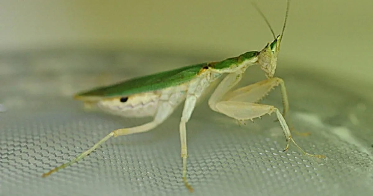 It's green with pointed eyes (it appears to have a pointy little head, too) and it grows to one-inch in length. Its scientific name is Pseudoharpax virescens (order Mantodea) and it's found in Gambia, the smallest country (in square miles) on the African continent.