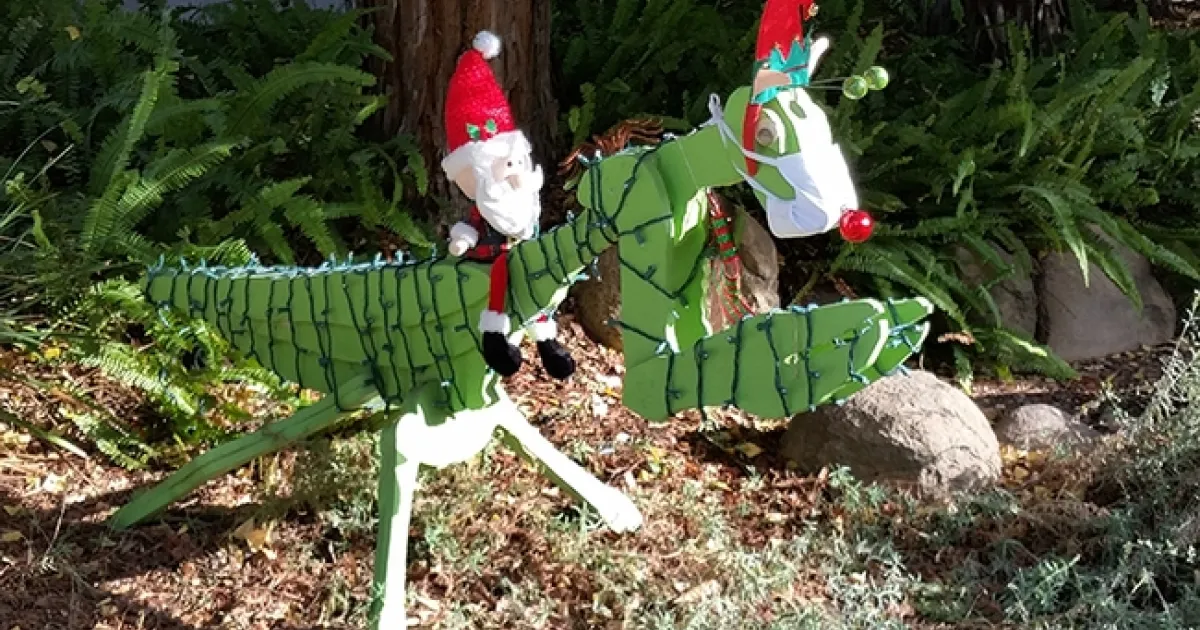 A masked mantis with Santa astride graces their front yard in Davis. The mantis? It's probably a Stagmomantis californica, native to the Western United States—and the Kimsey domicile.