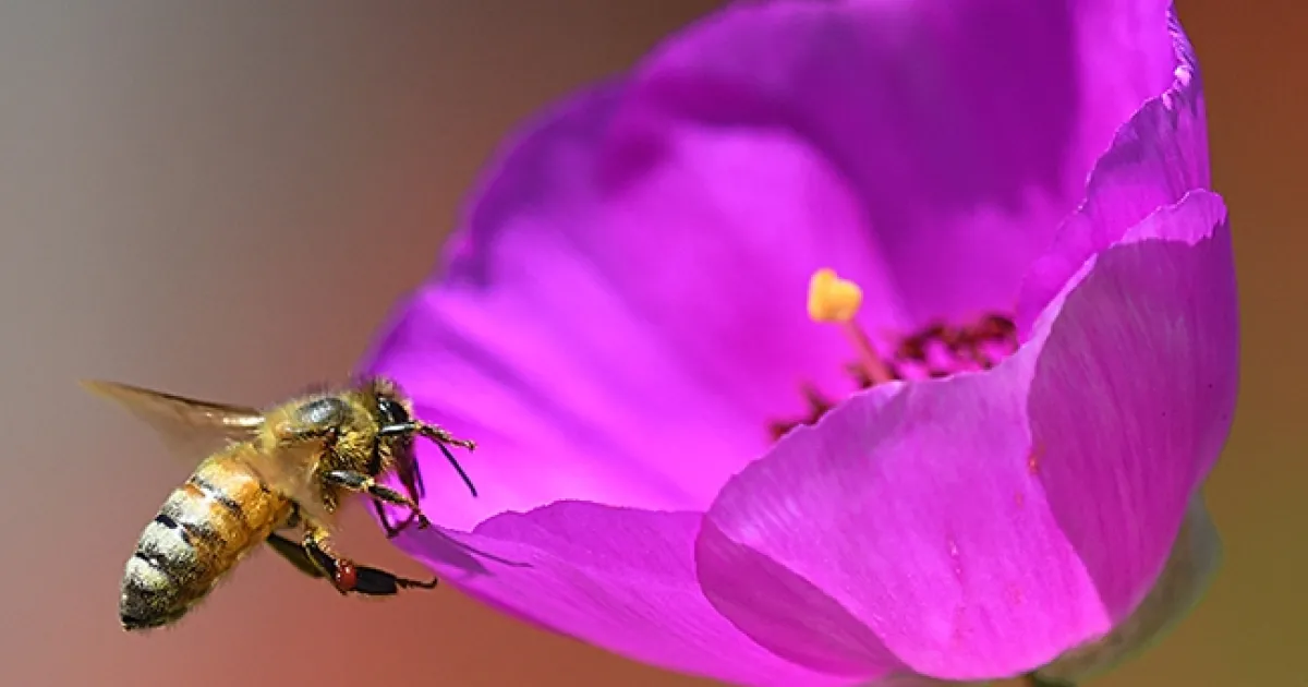 A honey bee touches down on a rock purslane, Calandrinia grandiflora. This plant yield red pollen. (Photo by Kathy Keatley Garvey)
