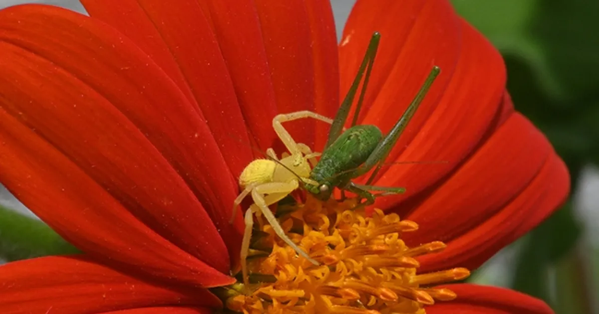 When a katydid (Tettigoniid) encountered a crab spider on a Mexican sunflower, Tithonia rotundifola, in our garden, the katydid didn't last long. The spider administered a venomous bite and it was all over. The small, aggressive predator dragged its large prey beneath the Mexican sunflower to consume its meal. The cycle of life...