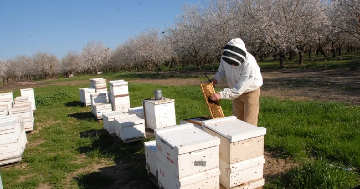 Bee breeder-geneticist Kim Fondrk of UC Davis manages the Robert Page specialized genetic stock. These bee hives were in a Dixon almond orchard. (Photo by Kathy Keatley Garvey)