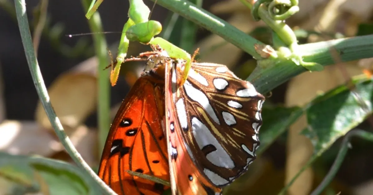 A praying mantis snares a newly emerged Gulf Fritillary butterfly. (Photo by Kathy Keatley Garvey)
