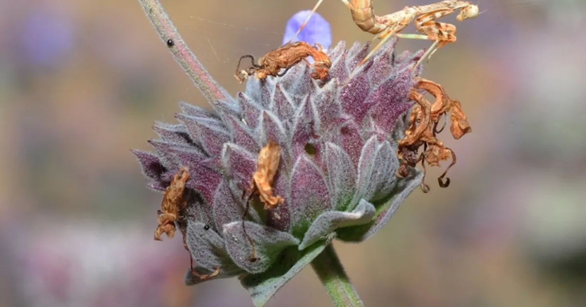 We spotted this immature praying mantis perched on top of a spiked Cleveland sage blossom, aka blue sage (Salvia clevelandii), waiting for a take-out dinner.