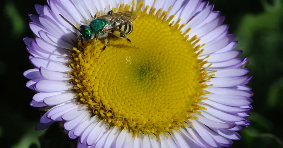 Male green sweat bee, Agapostemon texanus, nectaring on a seaside daisy, Erigeron glaucus Wayne Roderick at Tomales Bay. (Photo by Kathy Keatley Garvey)