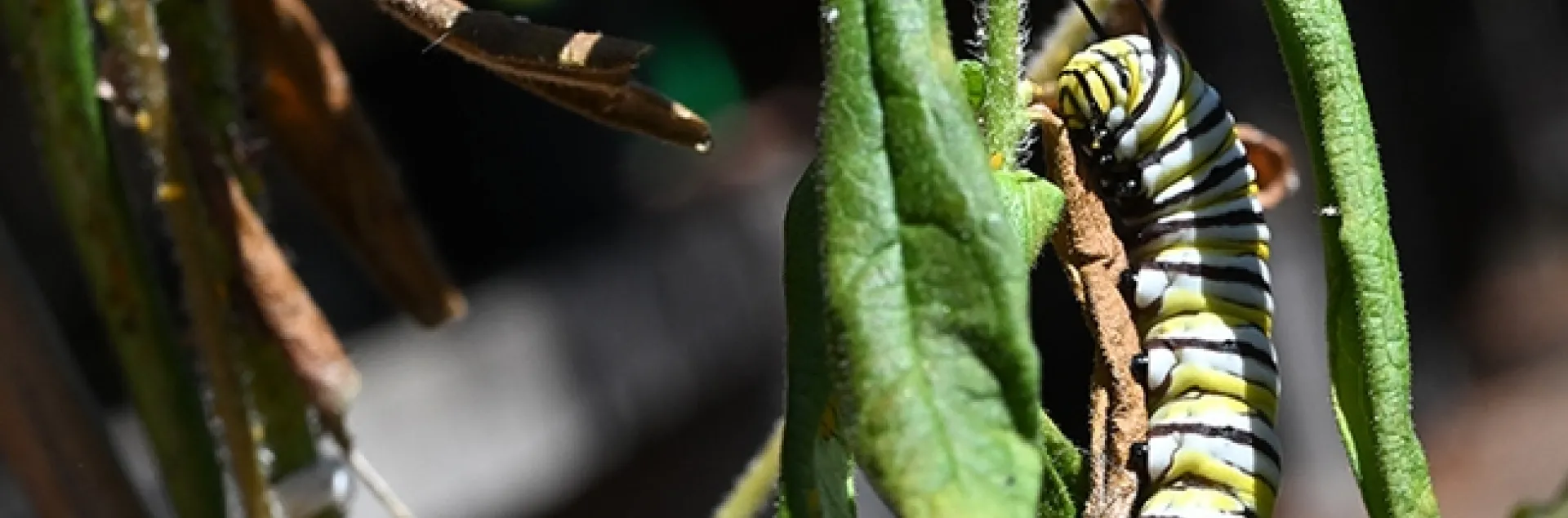 A late in-star monarch caterpillar appeared on our milkweed in our Vacaville pollinator-predator garden on the very last day of July.