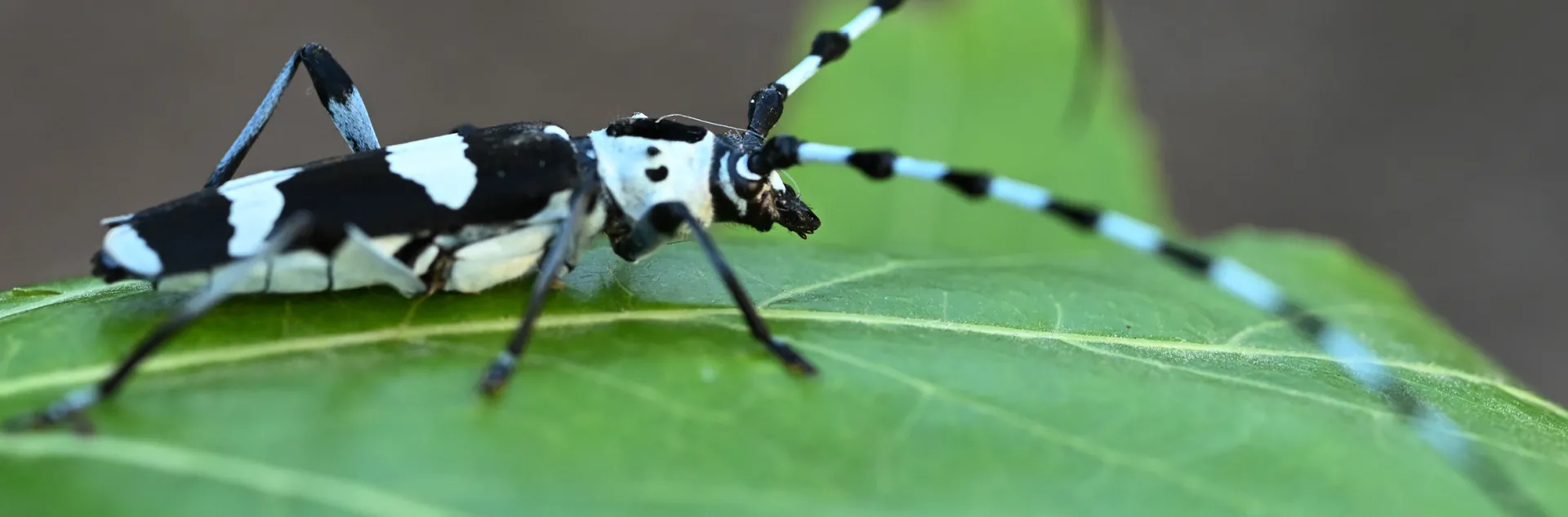 Look closely and you'll see the dark elytra (wing covers) with white bands and a white thorax with a large black spot. What's really striking, though, are the long, black-and-white banded antennae.