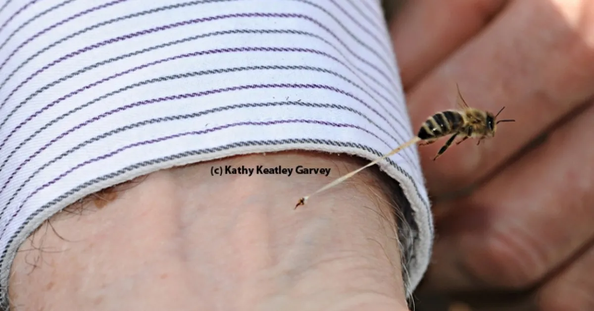 Take the case of "The Sting," a memorable lunch-hour photo that went viral. Extension apiculturist Eric Mussen and I were walking through the apiary of the Harry H. Laidlaw Jr. Honey Bee Research Facility, UC Davis, when he stopped abruptly. "Kathy, get your camera ready," he said. "A bee is about to sting me."
