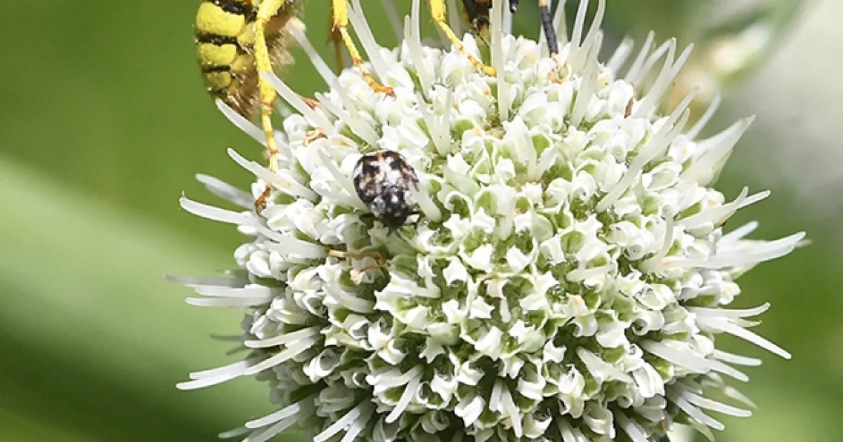 We recently spotted a crabronid wasp (genus Philanthus) foraging on a pineapple sea lily (Eryngium horridum).