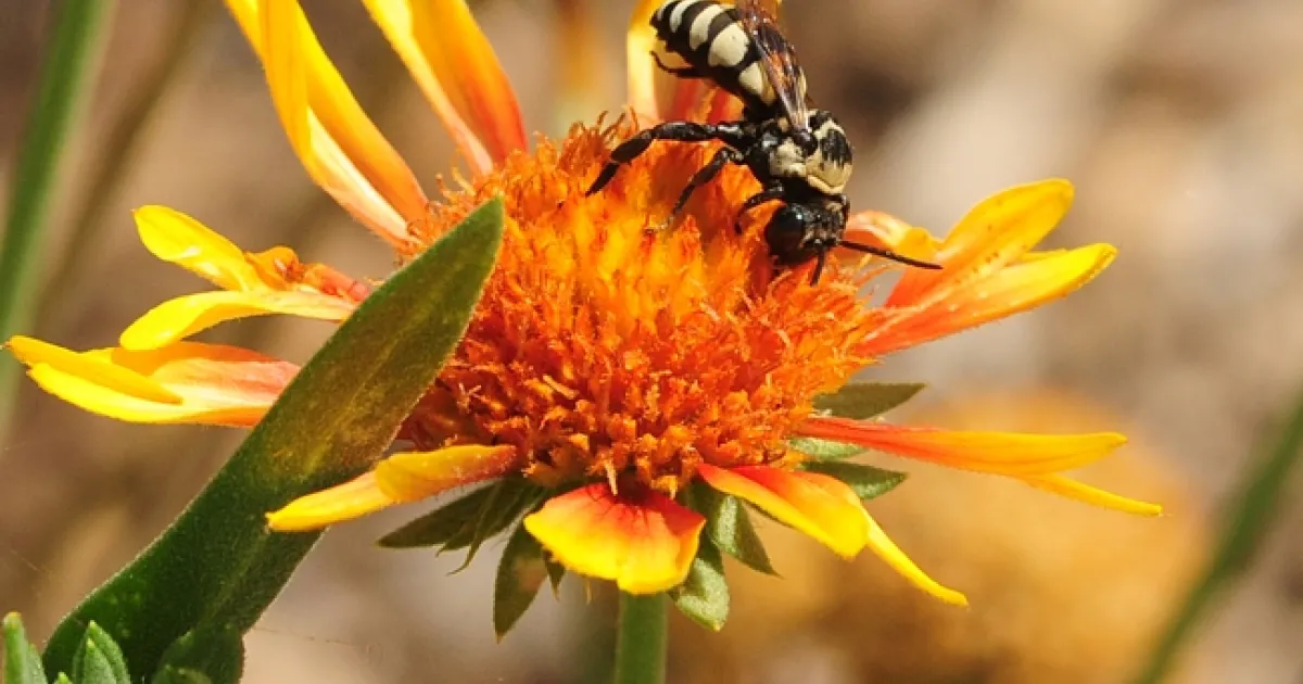 The cuckoo bee, nectaring on a blanket flower (Gaillardia), is just one of the species he's found in the garden.