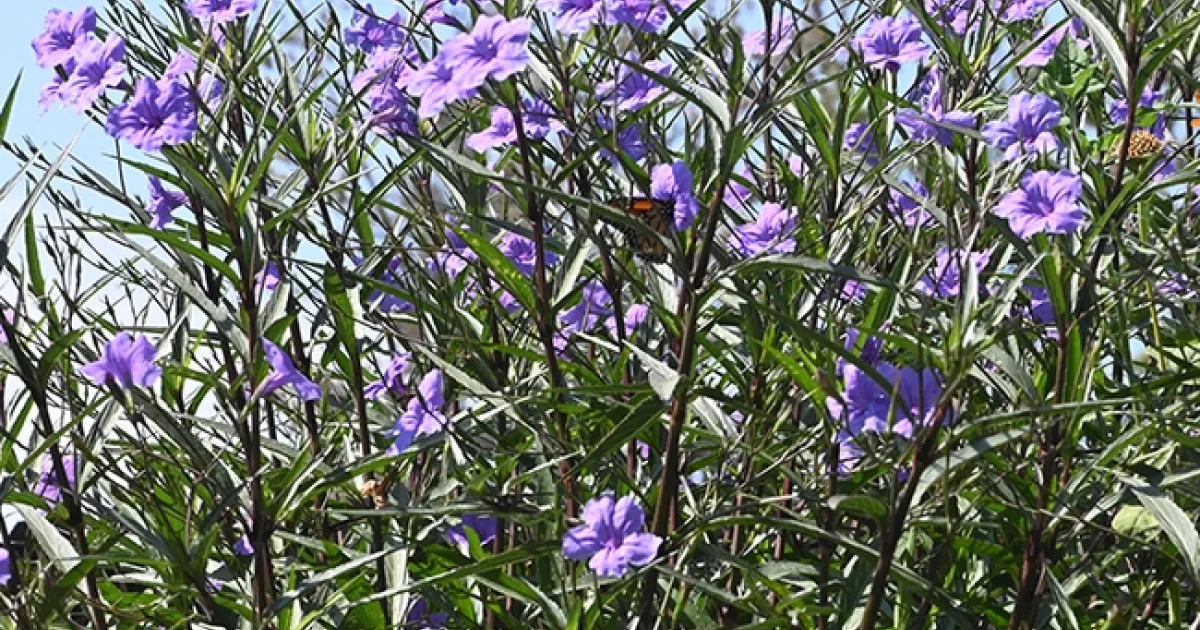 The milkweed grew, blossomed and went to seed. Ditto the Mexican sunflowers (Tithonia rotundifola). But the patch of Mexican petunia (Ruellia brittoniana) is thriving. The plant is a plucky perennial with purple, petunia-like flowers.