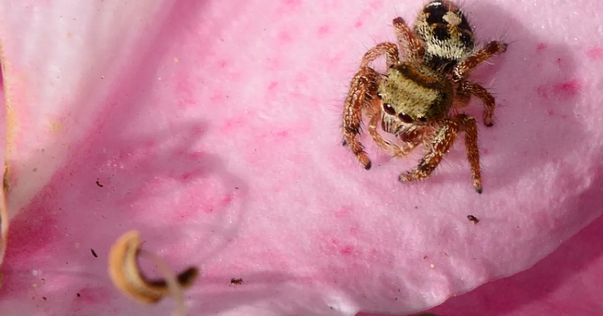 A jumping spider on a pink rose soaks in some sun. (Photo by Kathy Keatley Garvey)