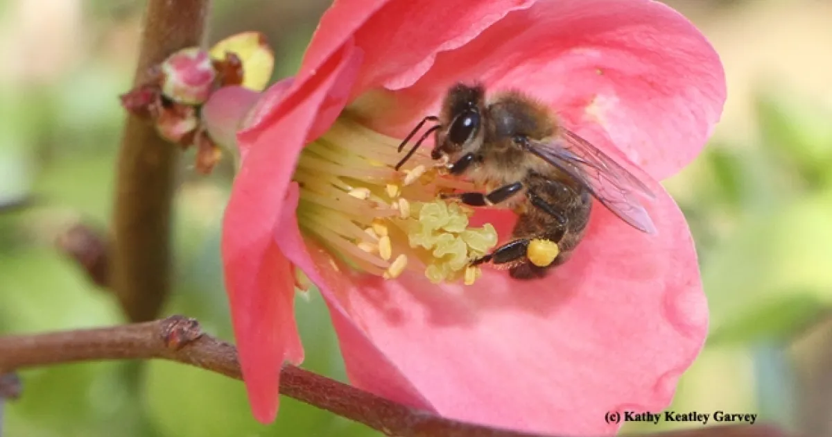 The flowering quince (genus Chaenomeles) from the rose family (Rosaceae) is among the first flowers of the new year to bloom. The soft pinks loaded with gold--yellow pollen--are the best!