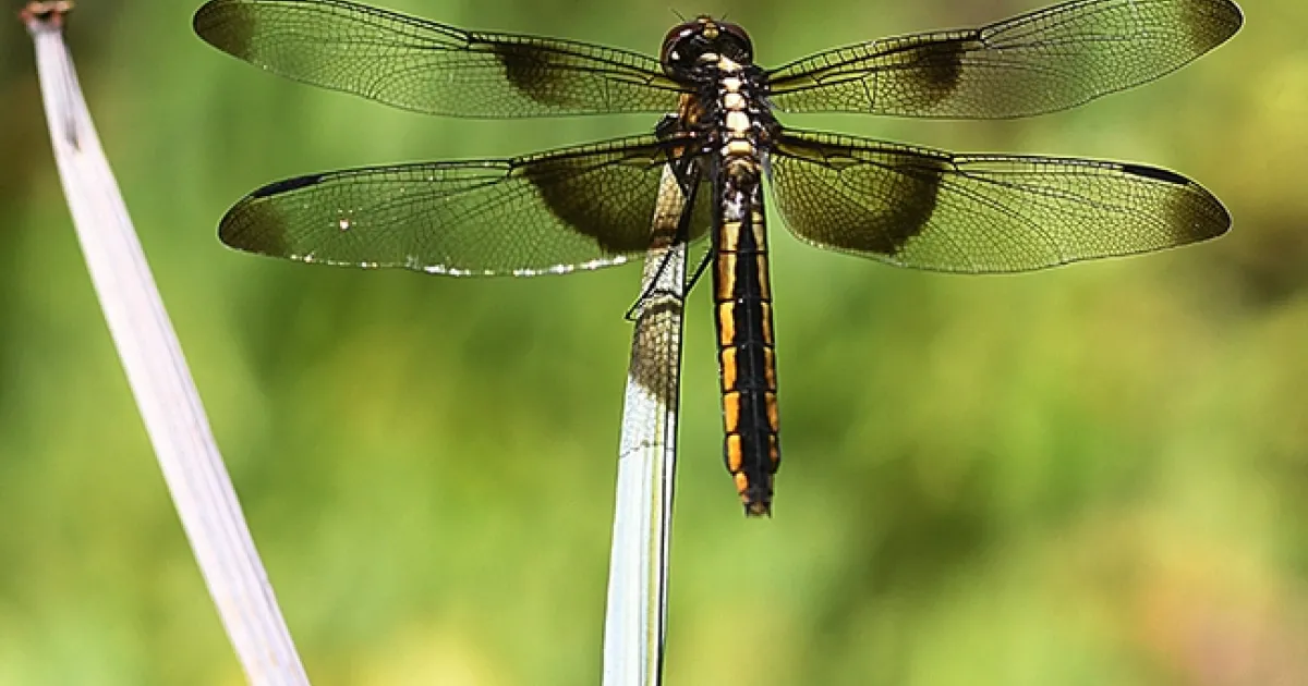 We spotted this female widow skimmer dragonfly (Libellula luctuosa) on Friday morning, June 26 in the Ruth Risdon Storer Garden of the UC Davis Arboretum and Public Garden. She flashed her steel-blue coloring and her black basal-banded wings as she zig-zagged from one perch to the other, catching and consuming flying insects.