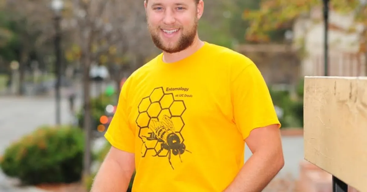 Graduate student Danny Klittich won the UC Davis Entomology Graduate Student Association's annual t-shirt design contest with a design depicting a honey bee and the iconic hexagonal cells.