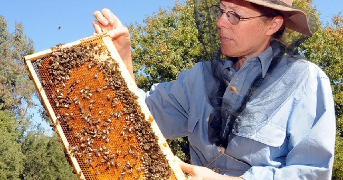 Bee breeder-geneticist Susan Cobey of WSU, former of UC Davis, with a frame at the Harry H. Laidlaw Jr. Honey Bee Research Facility. (Photo by Kathy Keatley Garvey)