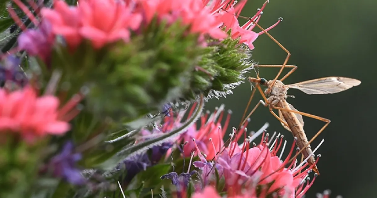 A common crane fly, Tipula oleracea, on a tower of jewels, Echium wildpretii. (Photo by Kathy Keatley Garvey)