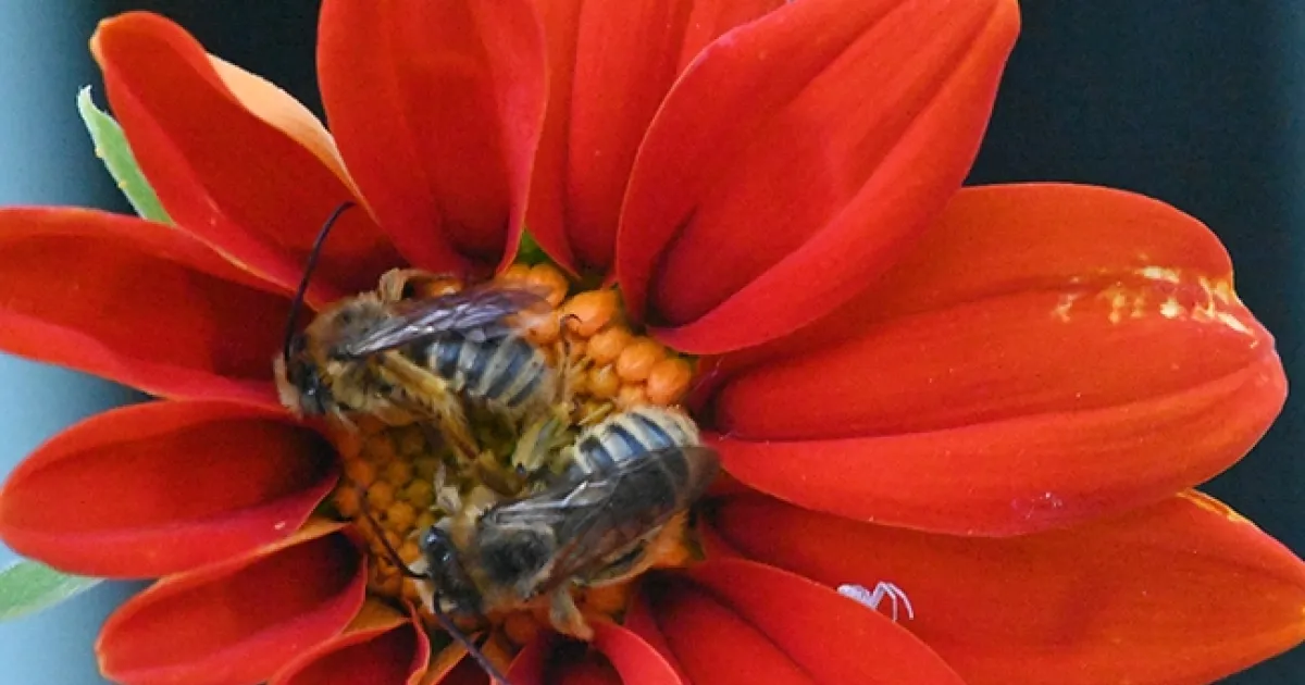 Such was the case last night when a Mexican sunflower, Tithonia rotundifola, drew two Melissodes agilis and one crab spider. Ah, it was just a teeny tiny crab spider.