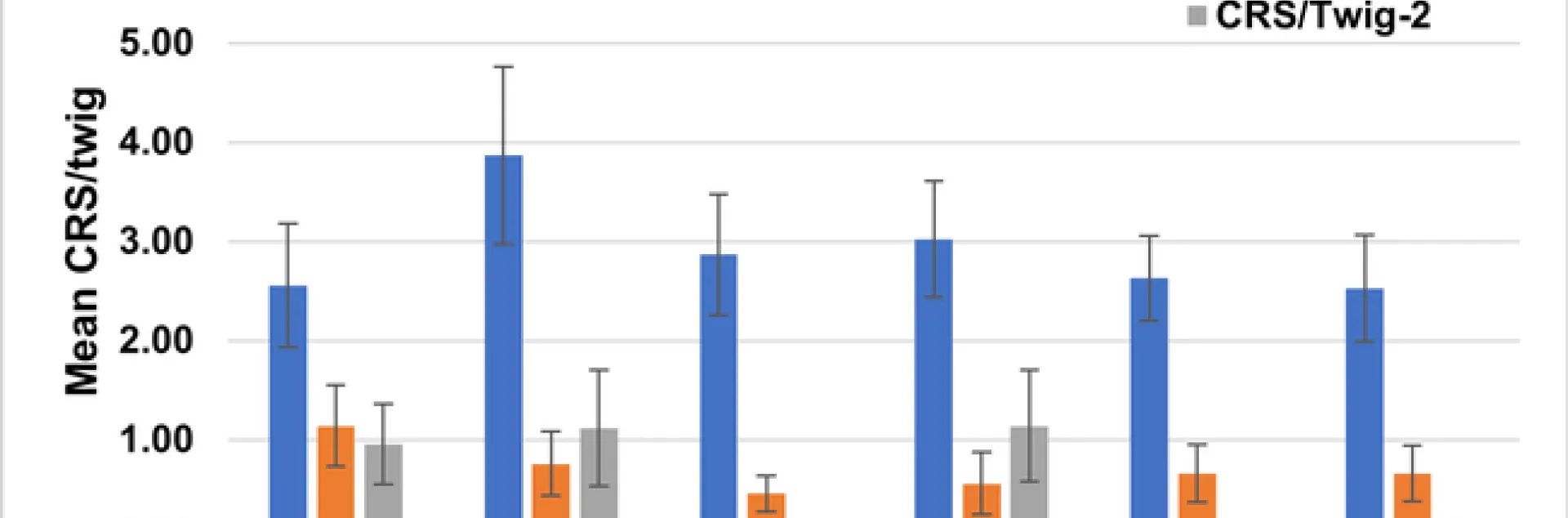 Figure 5. Mean live CRS/twig before and after treatments. Treatments were applied on July 28. Pretreatment count was done on July 25, and post-treatments counts were done on September 23, and October 12, respectively.