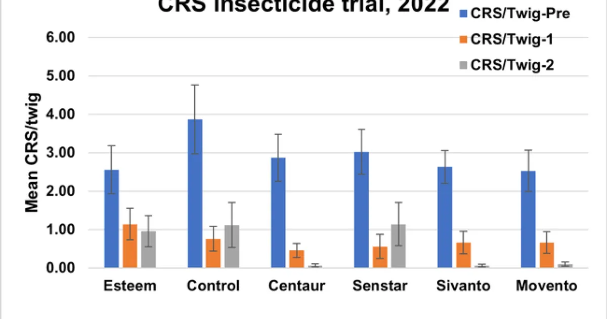 During 2022, our group studied the impact of multiple insecticide treatments on California red scale. The trials took place at the Lindcove Research and Extension Center. The trials were conducted as single tree applications and replicated 10 times. One application was made on July 28, following the crawler emergence. We rated the twigs on 23 September and twigs and fruit on 12 October for the presence of live California red scale. We also rated fruit for infestation by CRS, 0=no red scale, 1=1-10 scale, 2= >10 scales/fruit. The insecticides applied were Movento 10 fl. oz, Sivanto 14 oz, Centaur 46 oz, Senstar 20 oz, and Esteem 16 oz. All insecticides were applied with 1% Omni 6E 415 oil. Foliar applications of insecticides were made using a 100-gal high-pressure D30 diaphragm pump sprayer with mechanical agitation with a hand wand sprayer containing D6-nozzle at 250 psi. Treatments were applied in 750 gallons of water, except for Movento which was applied in 250 GPA, and Centaur which was applied at 1,000 GPA.