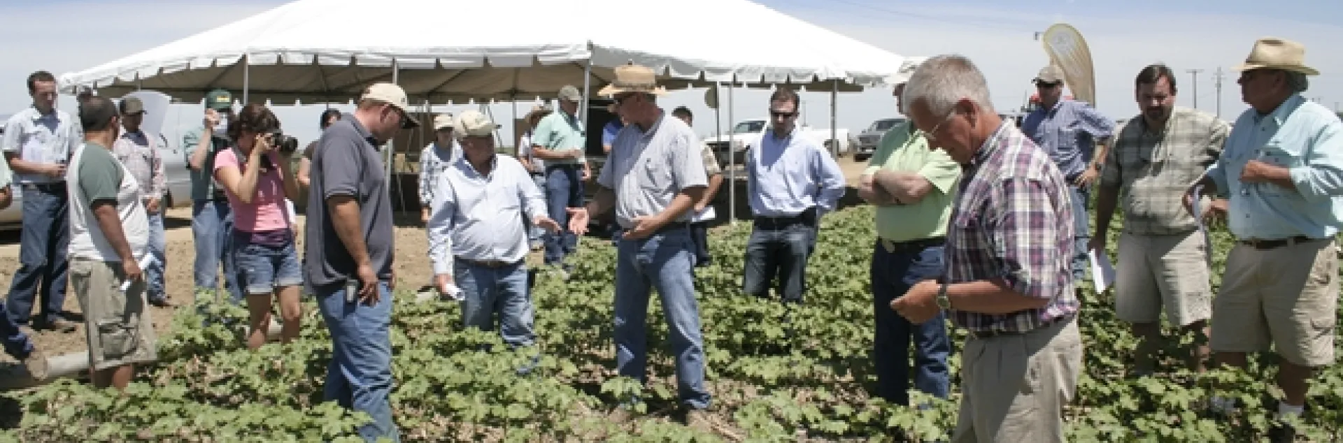 Farmers visited the site of the new research during a workgroup meeting June 28 at the UC West Side Research and Extension Center near Five Points. At the first stop, the researchers introduced growers to conservation tillage research that compares no-till cotton and tomatoes planted in the residue of cover crops with crops grown using standard practices. These plots are furrow irrigated.