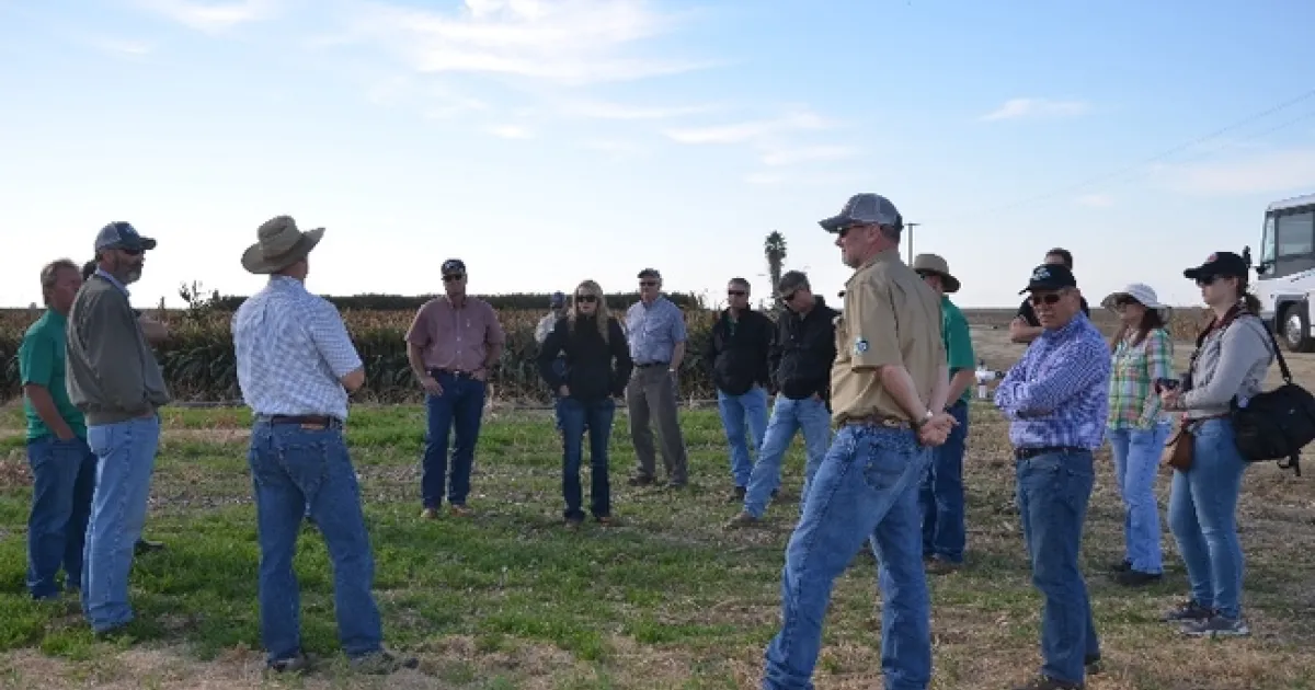 Dan Munk (light blue shirt and wide-brimmed hat at left) hosts Steve Vasquez’s TKI Crop Vitality at the long-term NRI Project study site in Five Points, CAVeteran UCCE soil, water and cotton Advisor, Dan Munk, of Fresno County, hosted a group of sixteen agronomists who work with the international fertilizer company, TKI Crop Vitality, at the long-term NRI Project study site in Five Points, CA on Friday, October 14th as part of a California tour organized by former UCCE Advisor and currently TKI regional agronomist, Steve Vasquez. Munk shared with the group the research history of the NRI study and provided an overview discussion on water issues in California. The group's visit coincided with the 2016 harvest of grain sorghum that was conducted by local Riverdale, CA farmer, Connor McKean of McKean Farms.