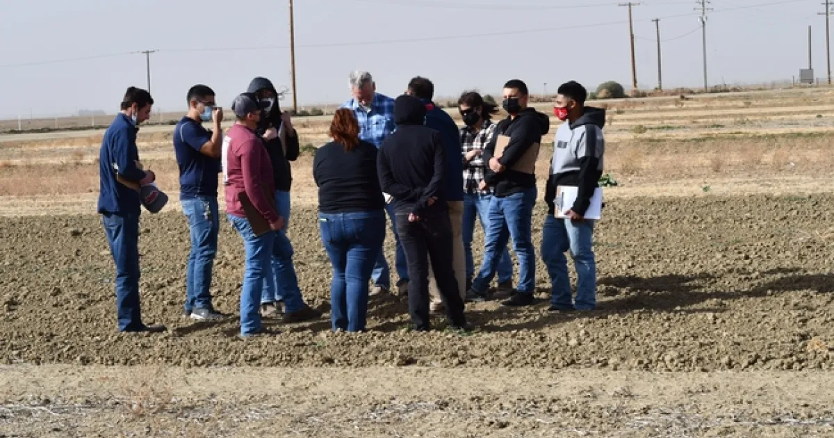 Students in the agronomy class of Dr. Ranjit Riar at Fresno State University had a rare opportunity to visit a working no-tillage research field as part of a field trip that they took to the NRI Project field at the University of California's West Side Research and Extension Center in Five Points, CA. On what was the windiest day of the year, the students braved the uncomfortable and blistering wind to see not only equipment that is used for reduced disturbance production, but also no-till soils and residues, as well as live demonstrations of soil aggregation and water infiltration. Jeff Mitchell of the Conservation Agriculture Systems Innovation Center at UC Davis hosted the group along with fellow CASI members Joy Hollingsworth and Dan Munk.