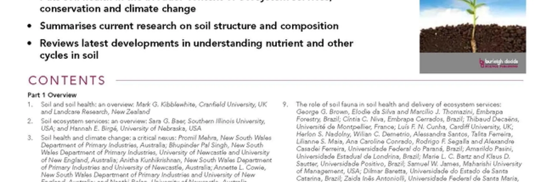 “Managing soil health for sustainable agriculture covers virtually the entire range of soil health topics. Dr Don Reicosky, himself an internationally distinguished soil scientist, has assembled an impressive roster of chapter authors. Each is a world-class specialist in the topic of the chapter. This collection of diverse chapters by highly respected authors promises to be a most interesting read