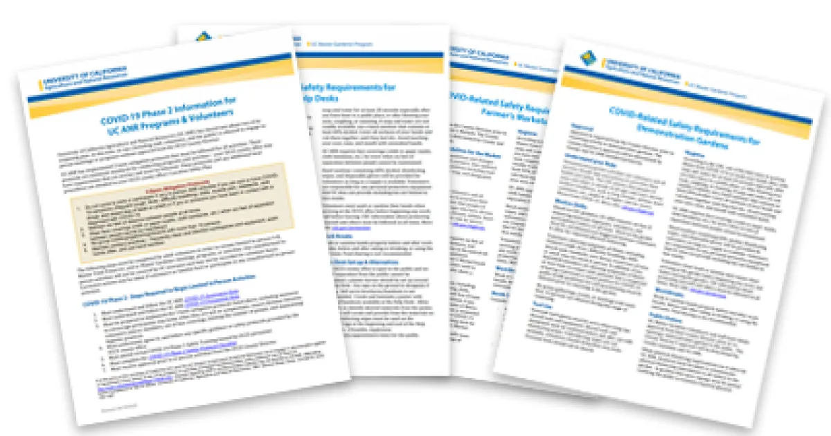 COVID-19 resource documents can be found on the statewide UC Master Gardener Program website under 'Resources' COVID-19 Safety Requirements, mg.ucanr.edu/COVID-19Safety