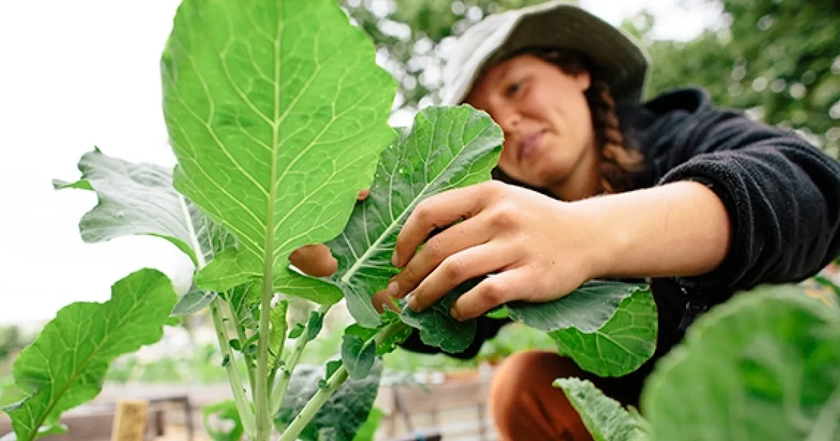 Person wearing a hat tending to leafy green plants, gently inspecting and handling the leaves in a garden.