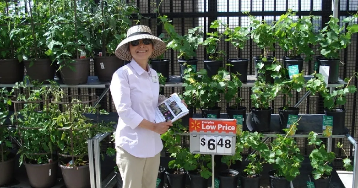 Woman wearing a sun hat stands in a garden center holding a pamphlet beside potted plants with a price sign.