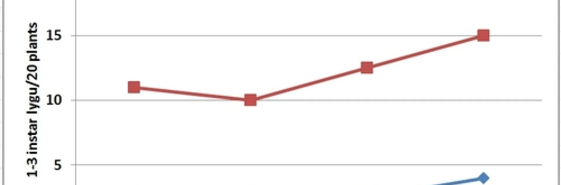 A higher number of lygus bugs were seen in the organic field than in the conventional field throughout the observation period. While the older nymphs and adults stayed at or below the treatment threshold, younger nymphs were consistently above the threshold (2.5 to 4 per 20 plants) in the conventional field. In the organic field, they were consistently above the treatment thresholds during the observation period.