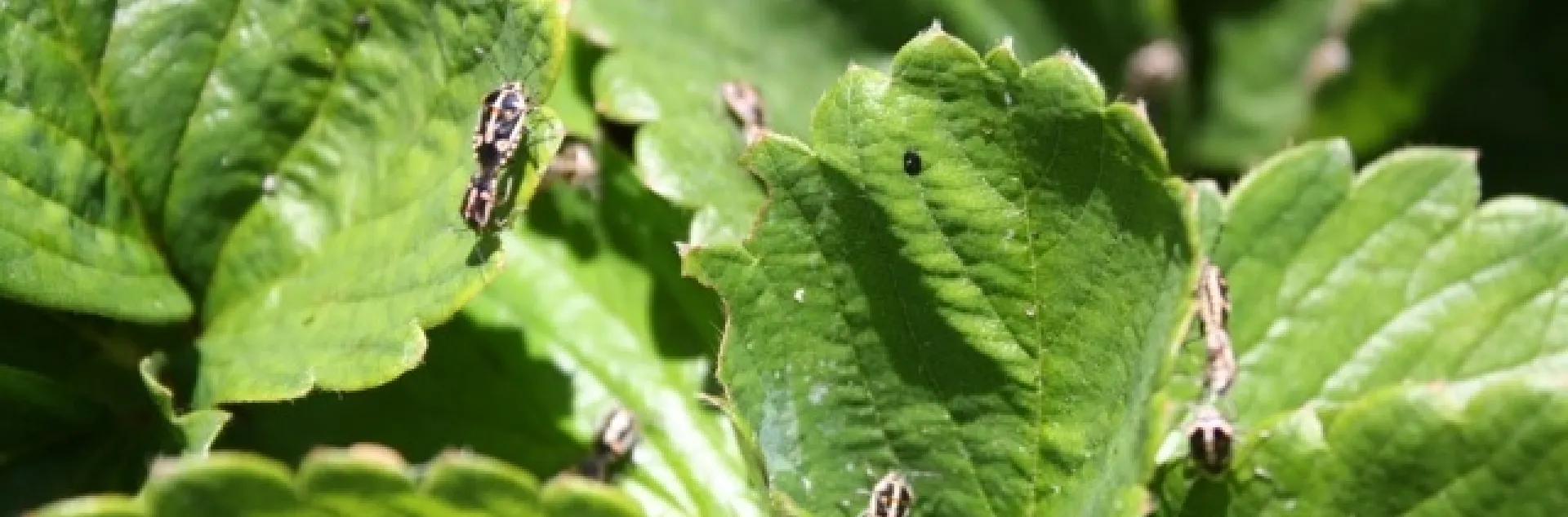 Bagrada bugs on strawberry foliage. Not seen to cause any feeding damage. (Photo by Jennifer Evangelista, San Luis Obispo)