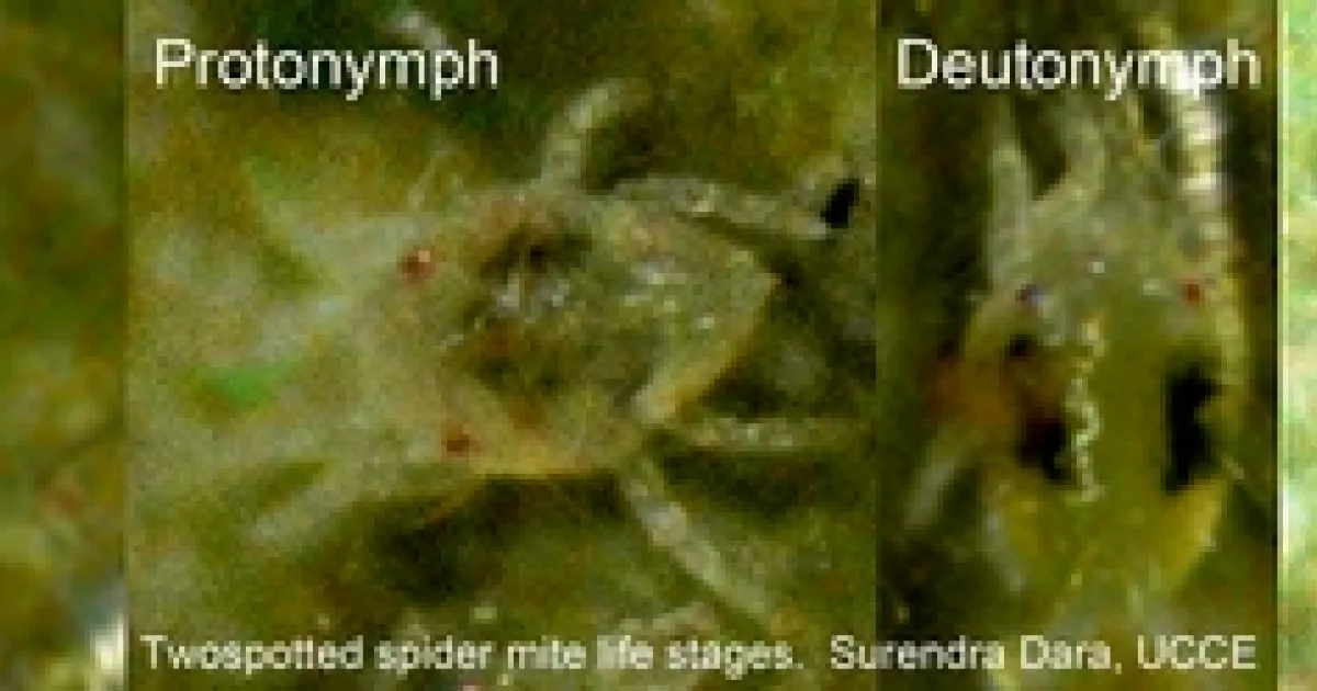 Twospotted spider mite, Tetranychus urticae Koch is a major pest of strawberries in California.  Spider mite damage reduces plant vigor and contributes to yield loss.  Twospotted spider mites are typically found on the lower side of the leaf and form webbing at higher population levels.