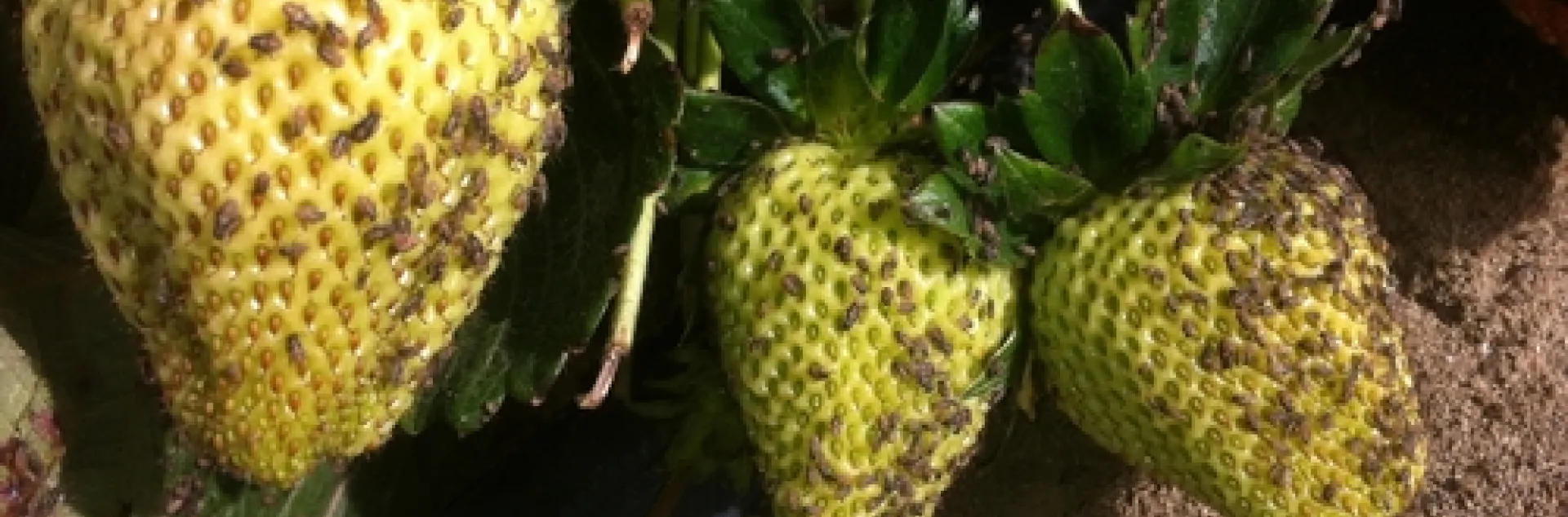 False chinch bug (Nysius sp.) infestation on strawberries (Photo by Sal Ponce, Pacific Coast Produce.