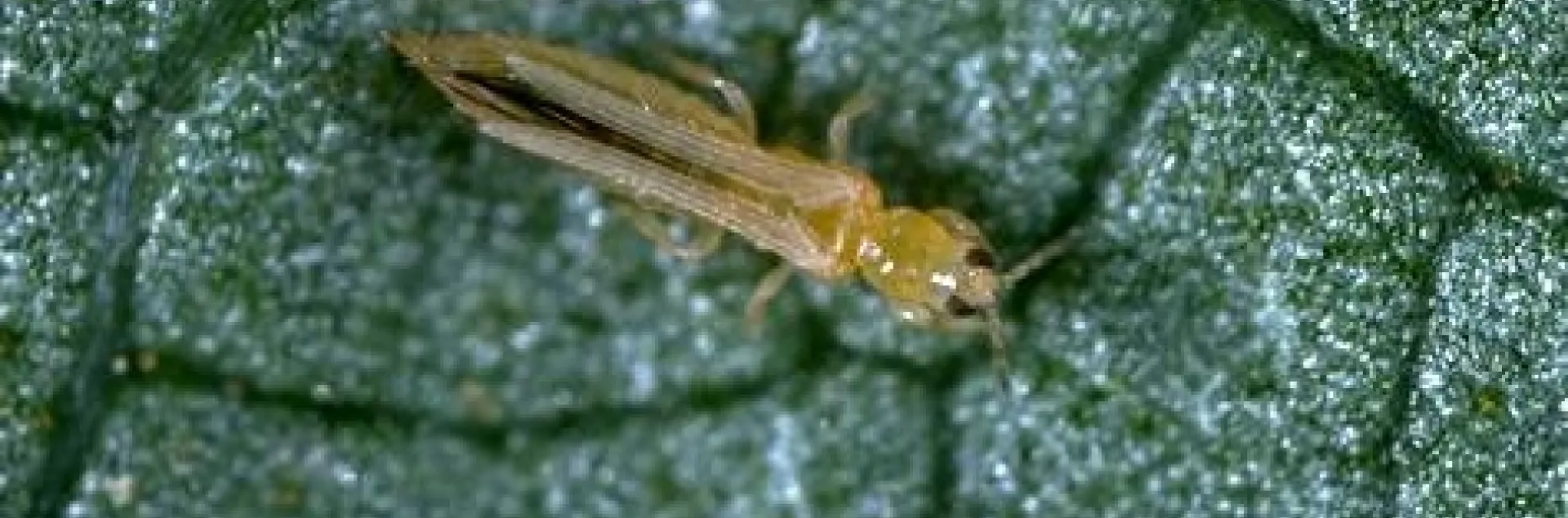 Green peach aphids (above) and western flower thrips adult (below). (Photos by Jack Kelly Clark, UC IPM)