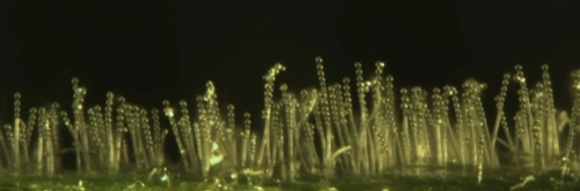 Conidial chains borne atop conidiophores. It is these stalk-like conidiophores that give mildew colonies their powdery appearance. Spores form at the bottom of the chain, so the oldest spores are at the tip of the chain. They break off in wind currents and can travel short distances, generally less than 100 meters. (Photo and description by David Gadoury, Cornell University)