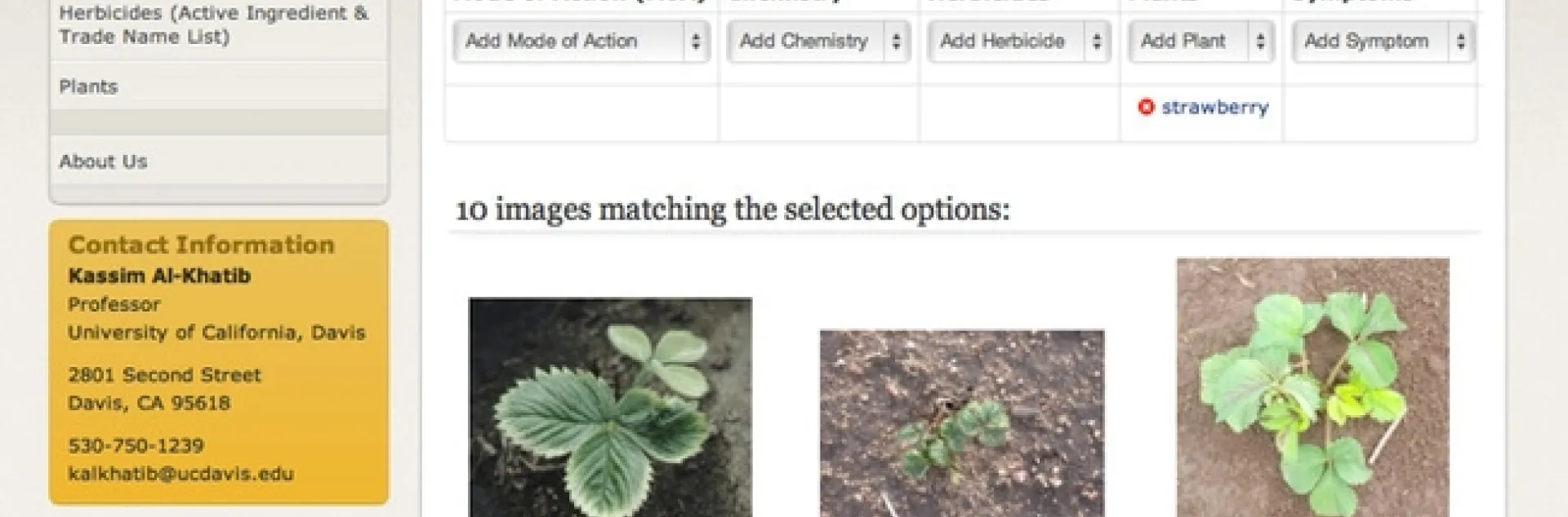 Dr. Kassim Al-Khatib, weed science professor at UC Davis and director of the UC Statewide Integrated Pest Management Program (UC IPM), has gathered nearly a thousand photos of herbicide-damaged plants, drawn from his own and others' research. The images are cataloged to show damage that can occur from 81 herbicides in more than 14 specific herbicide modes of action, applied in the field to demonstrate the symptoms or when known herbicide spray has drifted onto the plant.