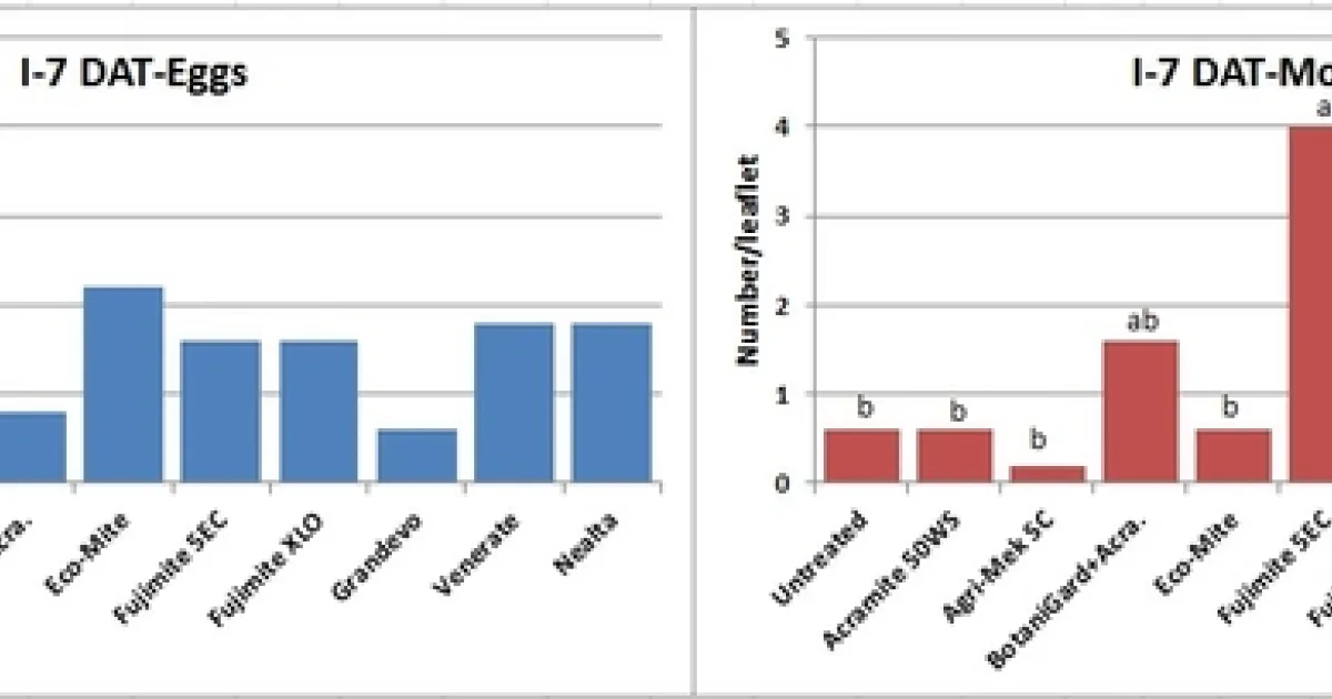 2013: In a small plot trial, the efficacy of bifenazate (Acramite 50WS, 1 lb/ac), abamecting (Agri-Mek SC, 4.29 fl oz/ac), B. bassiana (BotaniGard ES, 1 qrt/ac) + bifenazate (Acramite 50WS, 0.75 lb/ac), Eco-Mite (rosemary and cotton seed oil, 1%), fenpyroximate (Fujimite 5EC, 2 pt/ac), fenpyroximate (Fujimite XLO, 2 pt/ac), Chromobacterium subtsugae strain PRAA4-1 (Grandevo, 2 lb/ac), Burkholderia spp. strain A396 (Venerate XC, 2 gal/ac), and cyflumetofen (Nealta SC, 13.7 fl oz/ac) was compared. Treatments were applied twice at weekly intervals using a backpack sprayer at 150 gal/ac rate. Mites were sampled 3 and 7 days after each application.