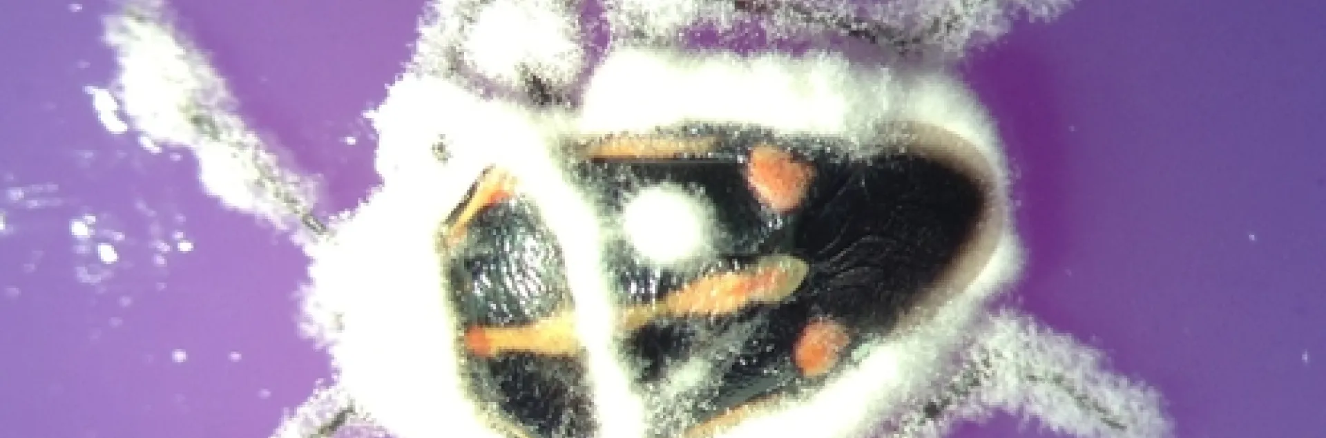 Bagrada bug adults infected and killed by commercially available formulations of three insect pathogenic fungi. Fungal spores penetrate the insect, spread through the body, kill the insect, and emerge from the cadaver producing more spores.
