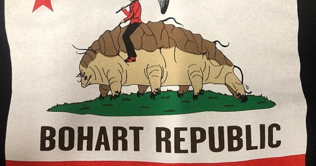 Alberts is an entomology doctoral candidate who studies Asilidae (Assassin flies) with her major professor, Lynn Kimsey, director of the Bohart and UC Davis professor of entomology. Alberts' work is a take-off of the California Bear Flag, except hers features an entomologist, insect net in hand, riding a huge tardigrade.