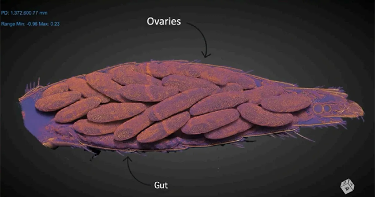 Her abstract: "Traditional methods of viewing the internal anatomy of insects require some degree of tissue manipulation and/or destruction. Using synchrotron-based x-ray phase contrast microCT (pcMicroCT) avoids this issue and has the capability to produce high contrast, three dimensional images. Our lab is using this technique to study the morphological changes occurring in the mosquito Aedes aegypti during its reproductive cycle. Ae. aegypti is the primary global arbovirus vector, present on all continents except Antarctica. Their ability to spread these viruses is tightly linked with their ability to reproduce, as the production of eggs in this species is initiated by blood feeding. Amazingly, this species produces a full cohort of eggs (typically 50-100) in just 3 days' time following a blood meal. This rapid development represents dramatic shifts in physiological processes that result in massive volumetric changes to internal anatomy over time. To explore these changes thoroughly, a time course of microCT scans were completed over the vitellogenic period. This dataset provides a virtual representation of the volumetric, conformational, and positional changes occurring in tissues important for reproduction across the vitellogenic period. This dataset provides the field of vector biology with a detailed three-dimensional internal atlas of the processes of vitellogenesis in Ae. aegypti."