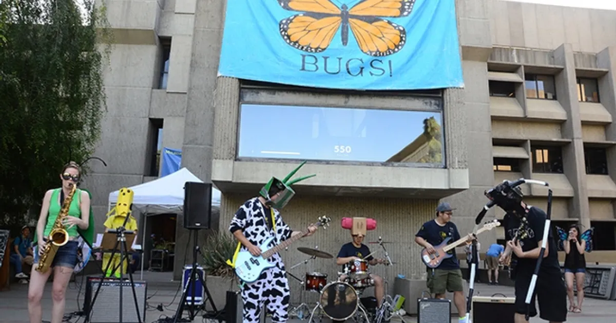 That's what happened during the recent UC Davis Picnic Day celebration when the septet gathered in front of Briggs Hall to perform three songs composed by talented musician and entomologist Michael Bollinger, enrolled in the master's degree program, UC Davis Department of Entomology and Nematology. The group performed Bollinger's compositions, “E Major Homeboy (Spissistilus festinus),” “Tragedy (of the Clocks)," and "Jackson's Song (Aedeagal Bits)," as well as a cover song, “Island in the Sun” by Weezer.