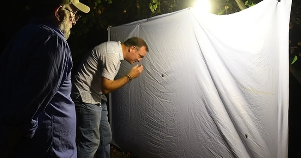 What's on the sheet? In this 2018 photo, UC Davis arachnologist Jason Bond checks for moths while "Moth Man" John De Benedictis observes. Bond, the Schlinder chair of Insect Systematics, UC Davis Department of Entomology and Nematology, was recently named associate dean of the College of Agricultural and Environmental Sciences. (Photo by Kathy Keatley Garvey)